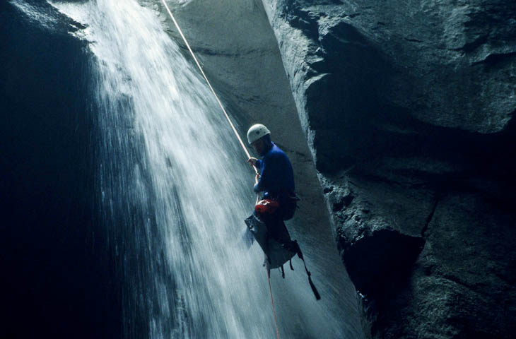 Canyoning ist im wesentlichen Bergsteigen nach unten im Wassermetier. Dazu gehört Schwimmen, Klettern, Springen, Rutschen oder Abseilen in engen Schluchten oder reißenden Bächen. Eine faszinierende, aber nicht ganz ungefährliche Sportart, denn die Gewalt des Wassers darf man nicht unterschätzen. Besonders schwierig ist dabei das Fotografieren, denn ich habe keine spezielle Unterwasserkamera, sondern nur meine ganz normale Fotoausrüstung dabei. Da heißt es, die Kamera immer wieder neu aus- und einpacken!