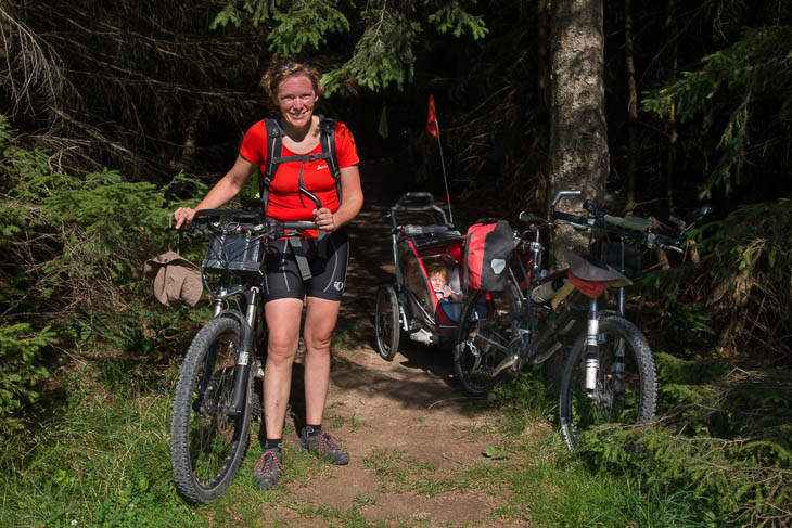 Am besten aber funktioniert das Radfahren mit einem geländegängigen Fahrradanhänger und einer verstellbaren weichen Federung. Mit einer Hängematte können schon Babys damit fahren. Das Radfahren hat sich für uns als beste Alternative herausgestellt, zumal wir das schon vorher intensiv betrieben haben.