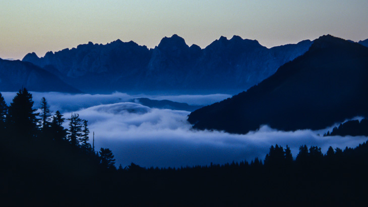 Und wieder einmal steigt der Abend aus dem Tal, als wir am Ziel angelangt sind. Der Wildkogelgipfel ist es heute, mit einem 360°-Gipfelpanorama: Wo komme ich her, wo gehe ich hin?
