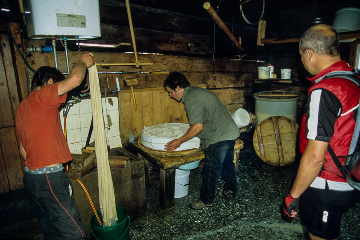 Vor der Stangenalm liegen ein paar faule Schweine, dösen in der Sonne und holen sich einen Sonnenbrand auf ihren rosanackten Schinken. Was für ein Idyll! In der Almhütte können wir zuschauen, wie der Pinzgauer Käse gemacht wird. Ein großer blankgescheuerter Kupferkessel steht im Raum, und ein junger Sennbursche bearbeitet mit einer uralten Holzpresse ein 50-kg-Käserad, während er uns bereitwillig die Arbeit auf der Alm erklärt.