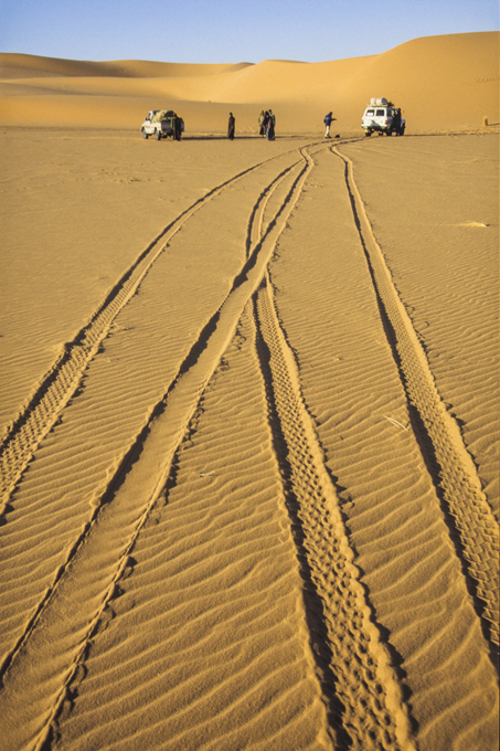 Zunächst fahren wir auf guten Asphaltstrassen Richtung Westen an die algerische Grenze in das Tassili-Maridet-Gebirges, wo die Strecken in reine Wüstenpisten übergehen. Da unsere Fahrer auch noch nicht in diesem Gebiet waren, müssen wir sogar noch einen Einheimischen für die Wegfindung mitnehmen.