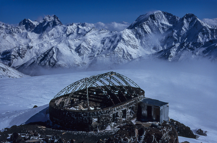 Nur wenige Wochen später brennt die bekannte aluminiumverkleidete Hütte Prijut 11 (4200 m) ab, so daß der Aufstieg jetzt 200 Meter tiefer gestartet werden muß. Damit ist die letzte vergletscherte Gipfeletappe ohne Biwak mit 1600 Meter Aufstieg ein ziemlich langes und kräfteraubendes Unternehmen geworden.