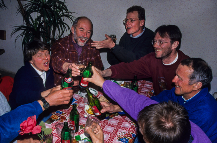 Dafür entschädigt uns ein phantastischer Pulverschnee bei der Abfahrt für das vorhergehende Schlechtwetter, und die Gipfelfeier im Tal fällt mit viel Wodka und Bier sehr feucht und fröhlich aus.