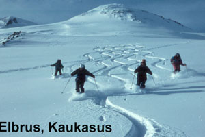 Leider haben wir so schlechte Wetter- und Schneeverhältnisse, daß die geplanten Skitouren weitgehend ausfallen und wir statt dessen tagelang den zweigipfligen Elbrus als unser wichtigstes Bergziel belagern. Erst am allerletzten Tag gibt uns das Wetter eine kleine Chance für einen Gipfelversuch, und sieben unserer zehnköpfigen Gruppe erreichen den Ostgipfel.
