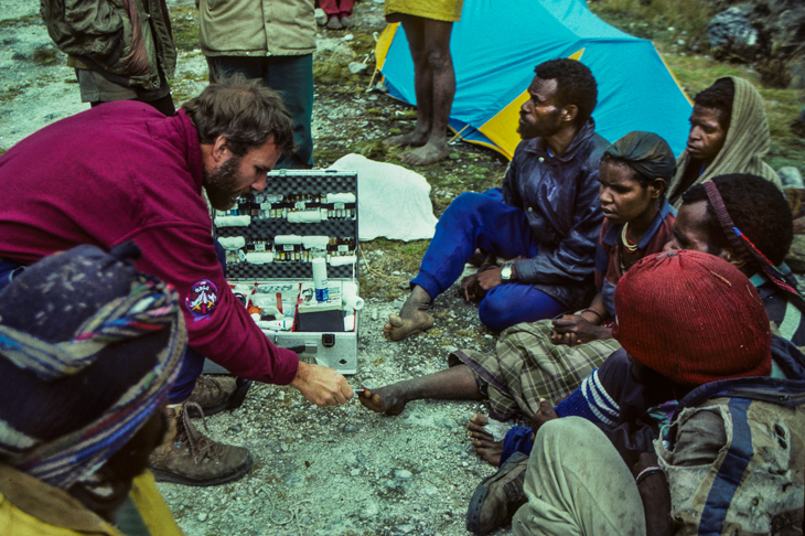Am dritten Rückmarschtag werde ich zu einem bewußtlosen Dani unter einem Felsüberhang gerufen. Mit anderen Papuas war er auf dem Rückweg von einem Ausflug zur Mine erkrankt und liegt jetzt schon seit längerem nicht ansprechbar im Koma. Der Ernst der Lage ist sofort erkennbar, und ich versuche mit Infusionen und Spritzen den lebensbedrohlichen Zustand zu stabilisieren. Es stellt sich heraus, daß der Dani höhenkrank ist bzw. ein Lungenödem hat und - wie wir erst viel später erfahren - schon seit vier Tagen hier auf über 3600 m Höhe liegt. Da eine Hubschrauberrettung nicht möglich ist, transportieren die Danis, sich abwechselnd, auf einer primitiven Trage aus Ästen den Schwerkranken übers Plateau, durch Sümpfe und Flüsse bis zu unserem nächsten Lager, wo es nicht mehr weitergeht. Da wir keinen Sauerstoff dabei haben und von der Höhe nicht herunterkommen, nützen auch meine verzweifelten Versuche mit hohen Kortison-Dosen nichts mehr - am Abend stirbt der erst 17-jährige Papua, ohne das Bewußtsein erlangt zu haben. Es zeigt sich wieder einmal, wie sehr wir trotz unserer technischen Fortschritte doch der Natur ausgeliefert sind. Alle sind niedergeschlagen, doch die Danis haben - wie alle Naturvölker - eine andere Einstellung zu Leben und Tod als wir. Unter unseren Trägern ist ein Pfarrer, der am nächsten Morgen eine Predigt hält. Dann wird der Verstorbene auf einen Scheiterhaufen gelegt und verbrannt.