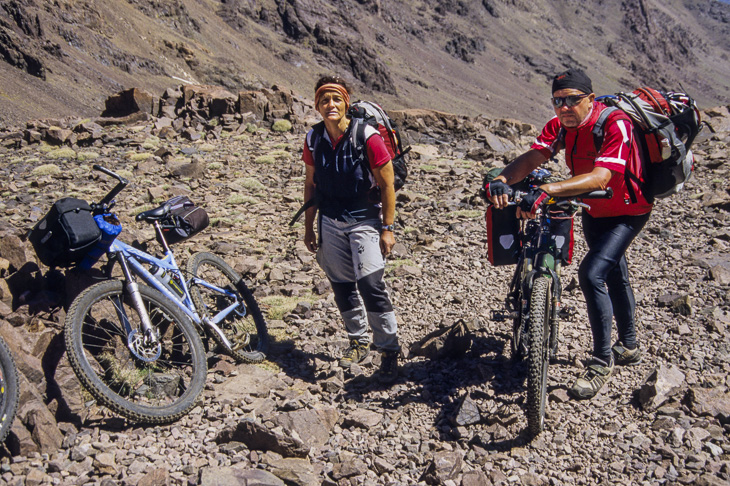 Von Marrakesch fahren wir etwa 70 km nach Imlil, einer kleinen Ortschaft am Fuße des Gebirges. Von hier aus schieben wir unsere Räder fast 1500 m bis zur Neltnerhütte. Sie ist Ausgangspunkt für den Djebel Toubkal, den höchsten Berg des Landes und Nordafrikas. Diesen Gipfel (4165 m) besteigen wir natürlich auch, für mich ist es bereits das dritte Mal.