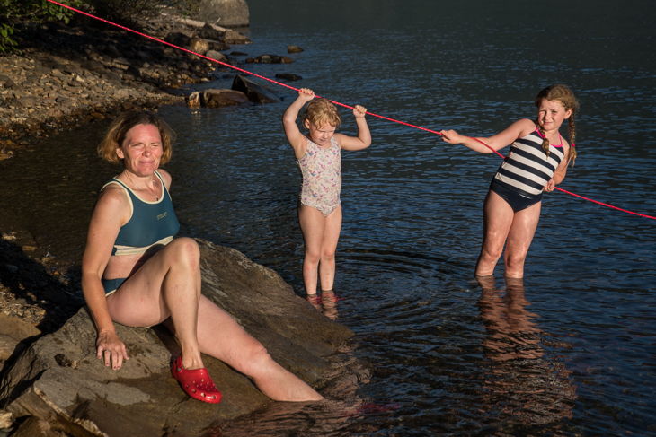 Am nächsten Tag bestaunen wir die riesigen schwimmenden Holzvorräte am Ende des Adams Lake. In der Nähe von Vernon besuchen wir die Familie Kurbis – sie sind Nachbarn von uns in Neuried und verbringen die Sommerferien bei ihren kanadischen Schwiegereltern. Wir können auf ihrem Grundstück übernachten und gehen gemeinsam zum Baden an einem nahegelegenen See.