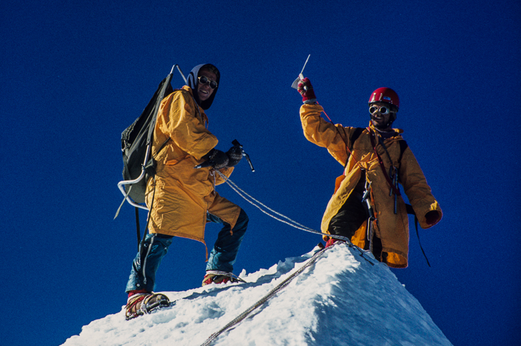 In der Nacht kommt ein fürchterlicher Sturm auf, der unserem armen Zelt ganz schön zusetzt. Walter geht sogar in die eisige Kälte hinaus, um es zusätzlich zu verankern. Doch am nächsten Tag ist das Wetter unerwarteterweise wieder gut, und der Gipfelsturm kann beginnen. Zunächst geht es noch relativ einfach über den spaltenreichen Gletscher bis an den Fuß des Gipfelaufbaus. Um den Gipfelgrat zu erreichen, müssen wir von hier aus ein fast 50 Grad steiles Couloir erklettern, wobei man in diesen Höhe ganz schön ins Schnaufen kommt. Der Gipfelgrat selbst ist eine schöne Firnschneide, die durch Felsen unterbrochen ist.