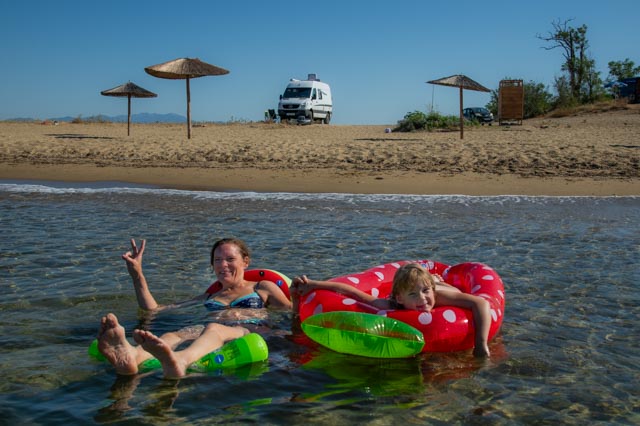 Dafür ist es einen Tag später umso einsamer: wir sind über Thessaloniki nach Norden und Westen Griechenlands gefahren und erreichen am Abend einen Traumstrand an der Ägäis. Weil man von der Autobahn noch ca. 20 km auf kleinen Straßen bis zur Küste hat, sind dort nur Einheimische anzutreffen, die aber am Abend alle nach Hause gehen. Glasklares Wasser, sauberer Strand und sogar eine Dusche – was will man mehr! Die Kinder wollen gleich einen ganzen Tag bleiben, aber das lässt der Reiseplan noch nicht zu.