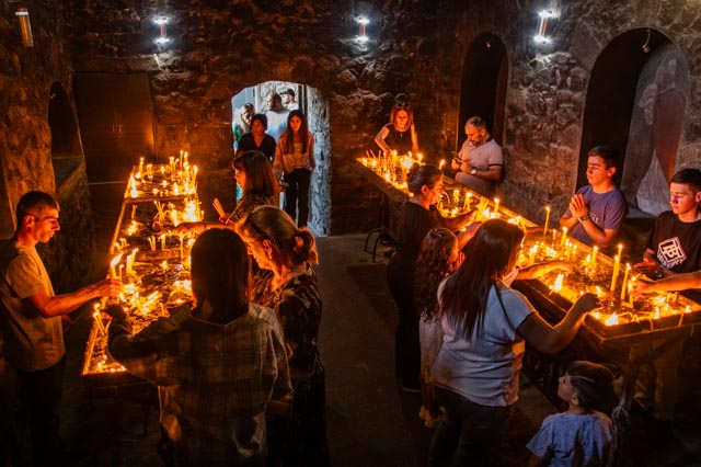 Da gerade wieder Wochenende ist, kommen sehr viele Armenier zum Kloster Sewanawank, einem Wallfahrtsort, und verbinden das Ganze mit Baden und Picknick. So erleben wir auch einen gesangsfreudigen Gottesdienst in der Kirche und fotografieren die heißen, stimmungsvollen Kerzenräume.