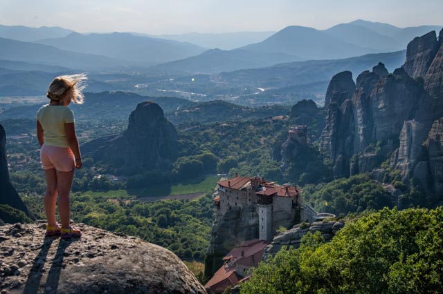 Die Überfahrt mit der Fähre nach Igoumenitsa in Griechenland ist erholsam, wobei wir mit „Camping on Board“ reisen und im eigenen Womo-Bett schlafen. Direkt vom Ankunftshafen fahren wir noch bis zu den Meteoraklöstern, erleben dort den Sonnenuntergang und entdecken bei der Nachtplatzsuche eine Herde von 37 Wildpferden, was die Kinder begeistert. In der Früh krabbelt sogar eine Schildkröte neben uns vorbei.