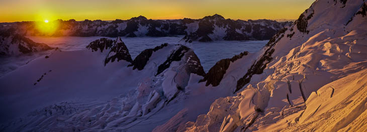 Als ich am Kreuzungspunkt mit dem Normalweg ankomme, sehe ich, dass die Seilschaft auf dem Normalweg gar nicht bis hierhergekommen und umgekehrt ist, da die alte Spur von einer Lawine überschüttet wurde. Die restlichen 400 Höhenmeter bis zum Gipfel erscheinen mir solo zu gefährlich – deshalb warte ich auf die Gratseilschaften hinter mir und ich habe die Gelegenheit, die wilde Landschaft zu genießen und zu fotografieren. Bis die Anderen eintreffen dauert es nochmal 2 Stunden – und alle entscheiden sich dann aus Vernunftgründen gegen einen Gipfelversuch. Gemeinsam steigen wir über den Normalweg ab, was nochmal einige Stunden erfordert. Als wir endlich wieder die Hütte erreichen, ist es erneut Mitternacht – und die nächsten Gipfelaspiranten stehen gerade auf. Wir waren also volle 24 Stunden ohne echte Ruhepausen unterwegs. Jetzt verstehe ich auch, warum aus Neuseeland so gute Bergsteiger kommen wie Edmund Hillary oder Rob Hall.