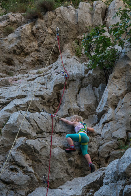 oatien finden wir den ersten einsamen Nachtplatz direkt an der Adria. In der Paklenica-Schlucht halten wir uns drei Tage beim Klettern auf. Allerdings ist es so heiß, dass wir uns bis zum Nachmittag nur im Schatten und in Wassergumpen aufhalten können. Doch dann fangen beide Kinder mit echtem Felsklettern an und haben viel Spaß bei den leichten Routen. Und Isabella traut sich sogar, die ersten Meter vorzusteigen. Eine Tagesetappe weiter finden wir als Geheimtipp eine völlig einsame Bucht, zu der man allerdings nur mit genauer Beschreibung, GPS und Allrad gelangt. Hier gefällt es uns so gut, dass wir gleich zwei Nächte bleiben. Obwohl gerade Wochenende ist, sind wir die Einzigen auf dem Land, während noch ein Boot in der Bucht ankert.