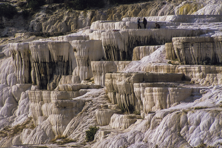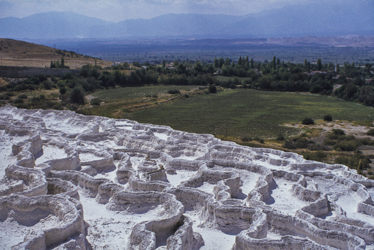 In der Gegend von Denizli, die wir als nächstes ansteuern, wird sehr viel Baumwolle angebaut, die auf Türkisch Pamuk heißt. inmitten der Baumwollfelder liegt Pamukkale - das Baumwollschloß. Durch die Ablagerungen von warmem, kalkhaltigem Wasser entstanden im Laufe der Zeit weiße, stufenförmige Kalksinterbecken an einem Berghang, die in der Sonne wirklich wie Baumwolle glänzen. Jetzt im Spätsommer sind die meisten Becken leider ausgetrocknet, doch in einigen finden wir noch etwas Wasser und können ein Fußbad nehmen. An einem warmen Bächlein nutzen wir die Gelegenheit, um unsere Wäsche zu waschen. Wo bekommt man auf Reisen sonst schon warmes Wasser her. Einige Türken finden das anscheinend sehr belustigend und schauen uns interessiert zu. Es gibt hier sogar ein antikes Schwimmbad, in dem einige alte Säulen herumliegen, über die man seine Bahnen ziehen kann.