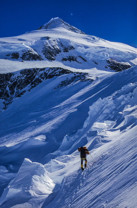 Am nächsten Morgen starten Ralf und ich als erste zum Gipfel, wobei ich diesmal - im Gegensatz zu anderen hohen Bergen - die letzte Etappe ausgiebig filme. Auf halber Höhe ziehen wir Überhosen und alle sonstige warme Kleidung an, da eiskalter Wind einsetzt. Auf einer direkten Route über einen steilen Schlußhang erreichen wir den Gipfel des Mount Vinson bei minus 25 Grad Celsius und Sturmwind. Trotz­dem halten wir uns mit Fotografieren, Filmen, Gipfeleintragung und Funken fast 45 Minuten auf dem höchsten Punkt der Antarktis auf. Der Gipfel ist erst 1966 von einer amerikanischen Expedition mit logi­stischer Unterstützung durch die Regierung erstbestiegen worden. Die Transport-Probleme mit Anreise per Flugzeug, mit Treibstoffdepots, schwie­rigen Wetter- und Kommunikationsproblemen sind so groß, daß erst 1989 die dritte Besteigung erfolgt. Diese führt zur Gründung von "Adventure-Network" und ist gleichzeitig der Beginn einer kommerziellen Antarktis-Erschließung für Bergsteiger sowie für Flugtouri­sten und Schlittenteams, die den Südpol aus eigener Kraft erreichen wollen. Seitdem haben mit Unter­stützung dieser Organisation bis heute circa 350 Bergsteiger den Mount Vinson erreicht - ich bin der neunte Deutsche. Viele Besteiger wollen ihre "Seven Summits" komplettieren - bis jetzt haben dies etwa 80 Bergsteiger weltweit geschafft.