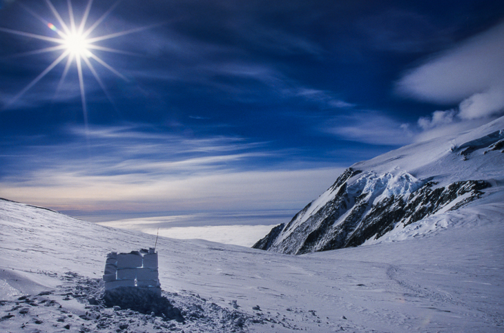 Der Abstieg durch verschneites Blockgelände auf der anderen Bergseite ist leicht, trotzdem dauert es eine Weile, bis wir wieder beim Lager 3 angelangt sind. Die ganze belgische Gruppe ist inzwischen ins Basislager abgefahren, nur Peter und Conrad haben noch eine Skitour hier oben unternommen. Da es schon spät ist, bleiben auch Gerard und Paulo hier oben und wir feiern alle zusammen im größten Zelt Silvester. Zum Schluß, d.h. um Mitternacht, sind wir allerdings nur noch zu dritt, da unsere beiden Tou­renbegleiter vorzeitig müde in ihren Schlafsack kriechen und Conrad um zehn Uhr abends auf die Idee kommt, noch schnell den Mount Shinn solo auf der gleichen Route wie wir zu besteigen. So feiern wir zu dritt um Mitternacht mit Champagner den Jahreswechsel bei minus 27 Grad Celsius. Bei dieser Tempe­ratur ist der Gang auf unsere Freilufttoilette schon eine ganz schön harte Angelegenheit! Endlich im warmen Schlafsack höre und sehe ich noch um circa zwei Uhr Conrad vom Mount Shinn zurückkommen.