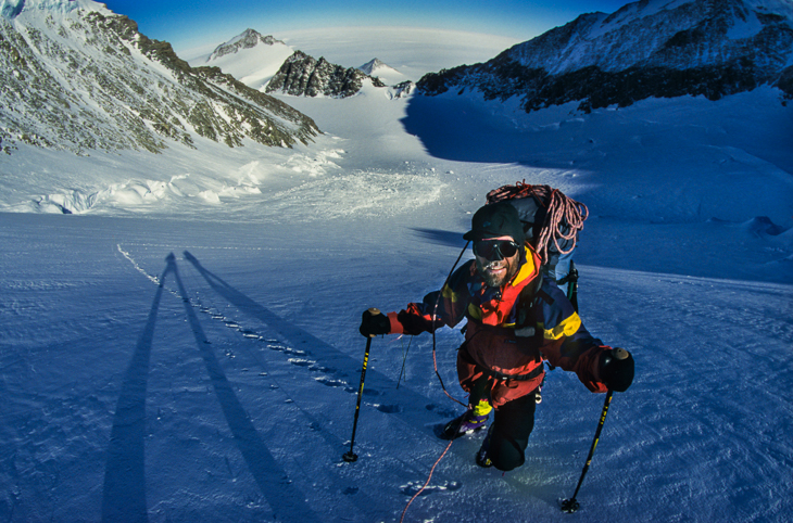 So starten Ralf und ich gleich am folgenden Tag zum dritthöchsten Berg der Antarktis, zum gegenüber­liegenden  Mount Shinn. Kurzentschlossen gehen auch noch zwei aus der Belgiergruppe mit uns: Ger­ard, einer der beiden französischen Führer, der gerade seine "Seven Summits" vollendet hat, und der beste belgische Bergsteiger Paulo. Nach einer langen Querung über den weiten Sattel und über Blan­keisfelder steigen wir spiralförmig den Berg hinauf. Den circa 50 Grad steilen Gipfelaufbau besteigen wir direkt und anspruchsvoll auf einer kombinierten Route über Eis und Fels, wobei der Schlußhang zwi­schen zwei riesigen Seracs hindurch auf den 4800 m hohen Gipfel hinaufführt. Diese Tour und das Gipfelpanorama sind sehr fotogen, aber wieder weht ein eiskalter Wind auf dem Gipfel. Beim Filmen hole ich mir durch den Kontakt mit Metall sogar eine leichte Erfrierung der Nasenspitze.