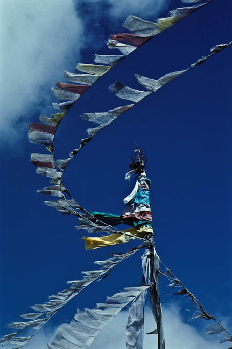 dem das Basislager eingerichtet ist, findet die traditionelle Opfer-Zeremonie der Sherpas statt, um die Hilfe der Götter für unsere Expedition zu erbitten. Unser Sirdar Nawang, ein Bruder des verstorbenen Sonam Tshiring von unserer Everest-Expedition von 1992, leitet als ehemaliger Lama (Klosterbruder) diese Zeremonie.