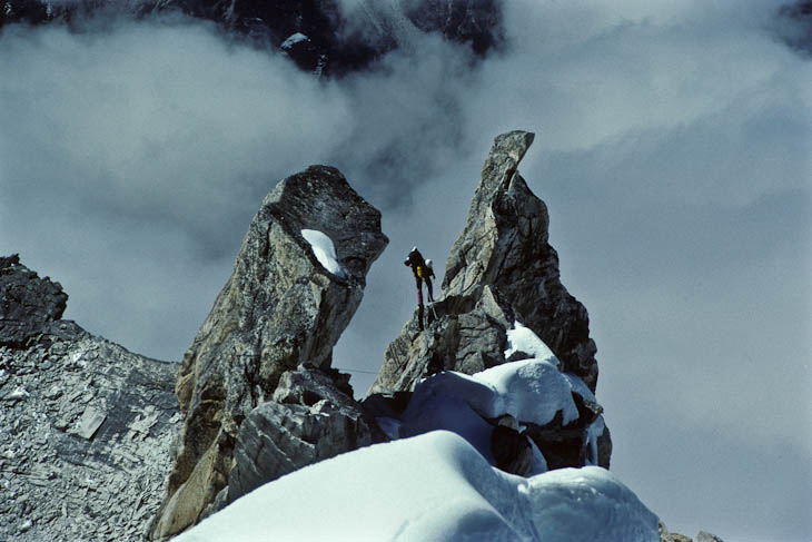 Nach weiterer Akklimatisation und einer ersten Übernachtung im Hochlager 1 klettern Ralf, Wolfgang und ich über den langen, gezackten, wenig aufsteigenden, aber sehr ausgesetzten Felsgrat zum Lager 2 auf 6000 Meter Höhe. Noch nicht voll adaptiert, kommt man in diesem Steilgelände mit vollem Rucksack ziemlich schnell zum Schnaufen. Trotz Fixseilen, die wir allerdings überprüfen, z.T. ersetzen oder ergänzen, ist doch eine solide Klettertechnik zum energiesparenden Vorwärtskommen nötig. Dafür belohnt uns dieser Abschnitt mit fantastischen Ausblicken und Kletterbildern. Die Schlüsselstelle knapp unterhalb des Lagerplatzes ist eine rötliche, zum Schluß fast senkrechte Felswand mit zwei Fixseilen im Schwierigkeitsgrad 5. Ich versuche dennoch trotz Plastikstiefeln und Rucksack, diese Seillänge stilecht, d.h. frei zu klettern, aber die letzten Meter gelingen mir dann doch nicht. Trotzdem sind wir sehr zufrieden, als wir den luftigen, auf einem Felsturm errichteten winzigen Lagerplatz erreicht haben. Hier ist nur Platz für drei Zelte, und rundherum geht es überall steil in die Tiefe. Wir steigen jedoch wieder ab, um uns im Basislager vor dem eigentlichen Gipfelversuch noch einmal zu erholen.
