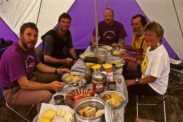 Im Basislager genieße ich die Glückwünsche unserer Mannschaft, ein gutes Abendessen und viel Flüssigkeit sowie mein eigenes Zelt, wo ich erschöpft, aber zufrieden über die vollbrachte Leistung relativ gut schlafe. Am nächsten Vormittag trudeln nach und nach die anderen Teilnehmer von oben im Basislager ein. Als alle zurück sind, wird erst einmal ordentlich gefeiert, gegessen und getrunken.