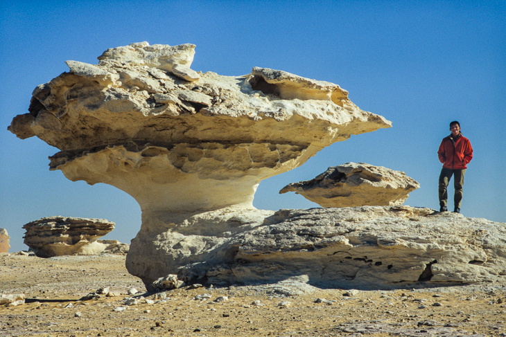 Unsere weitere Fahrt führt nach Südwesten in die White Desert, d.h. zu den östlichen Ausläufern der Libyschen Wüste. Bei der Nachtplatzsuche bleiben wir mit unserem normalen PKW im Sand stecken, aus dem wir am Morgen nur mit fremder Hilfe wieder herauskommen. Trotzdem fahren wir auf den Pisten weiter und verbringen mit unserem Zelt gleich noch eine Nacht in dieser faszinierenden Gipswüste mit ihren abwechslungsreichen Formationen.